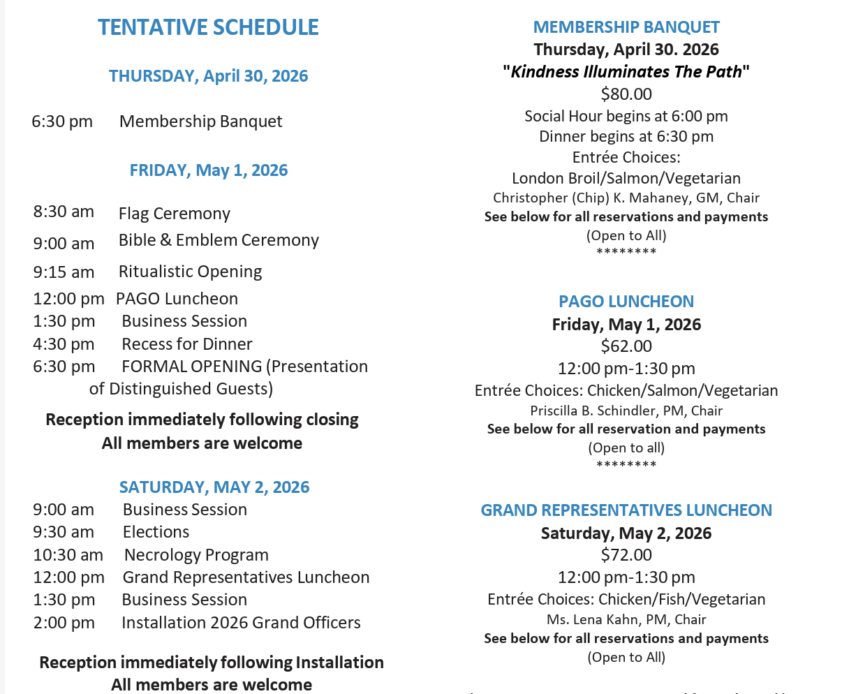 CREDENTIALS Members must show a current Receipt for Dues (2025 or 2026) and Sessions Registration Card to be admitted to a Grand Chapter Session. Please wear your registration badge at ALL SESSIONS.